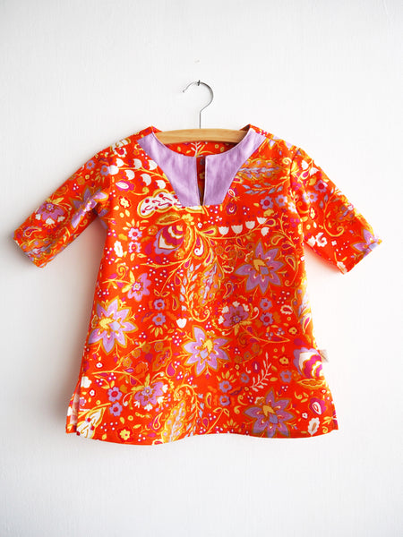Colors include lilac, hot pink, white, yellow and gold on an orange background.
